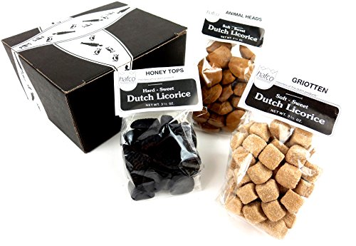 Hafco Dutch Licorice 3-Flavor Variety: One 3.5 oz Bag Each of Griotten, Honey Tops, and Cat Shaped in a BlackTie Box (3 Items Total)