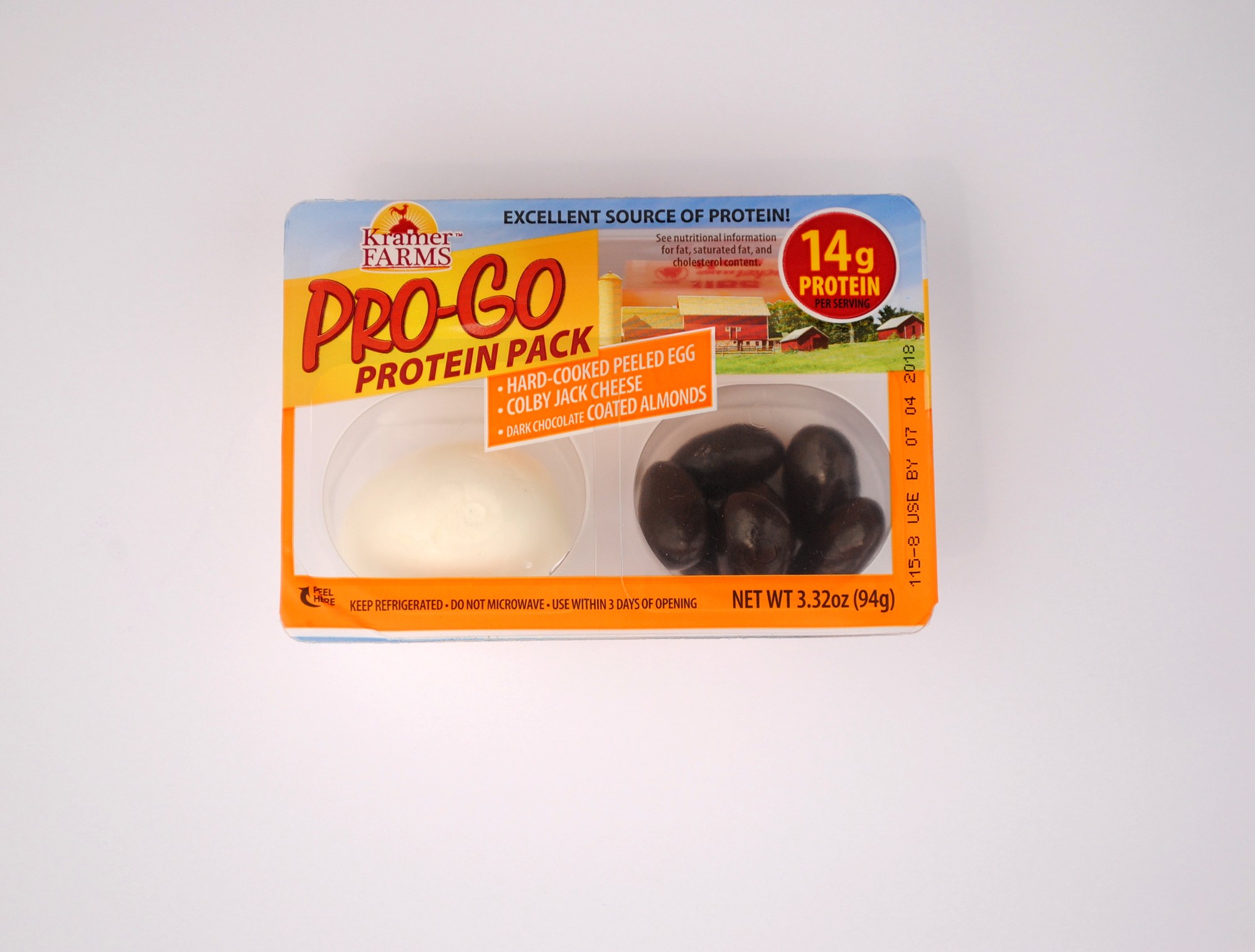 HARD-COOKED PEELED EGGS, COLBY JACK CHEESE, DARK CHOCOLATE COATED ALMONDS PRO-GO PROTEIN PACK, HARD-COOKED PEELED EGGS, COLBY JACK CHEESE, DARK CHOCOLATE COATED ALMONDS
