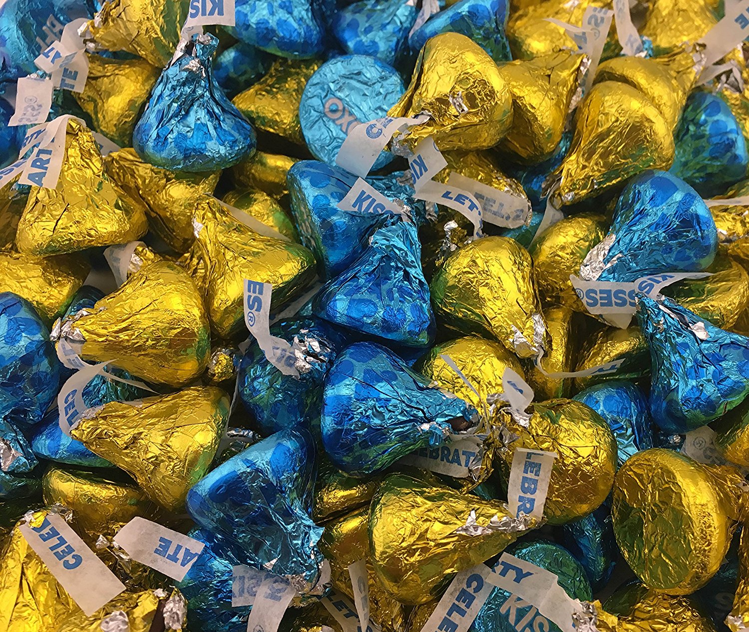 Hershey's Kisses Milk Chocolate, Conversation Milk Chocolate Candy Mix, Yellow Kisses and Blue Kisses Foils (Pack of 2 Pounds)
