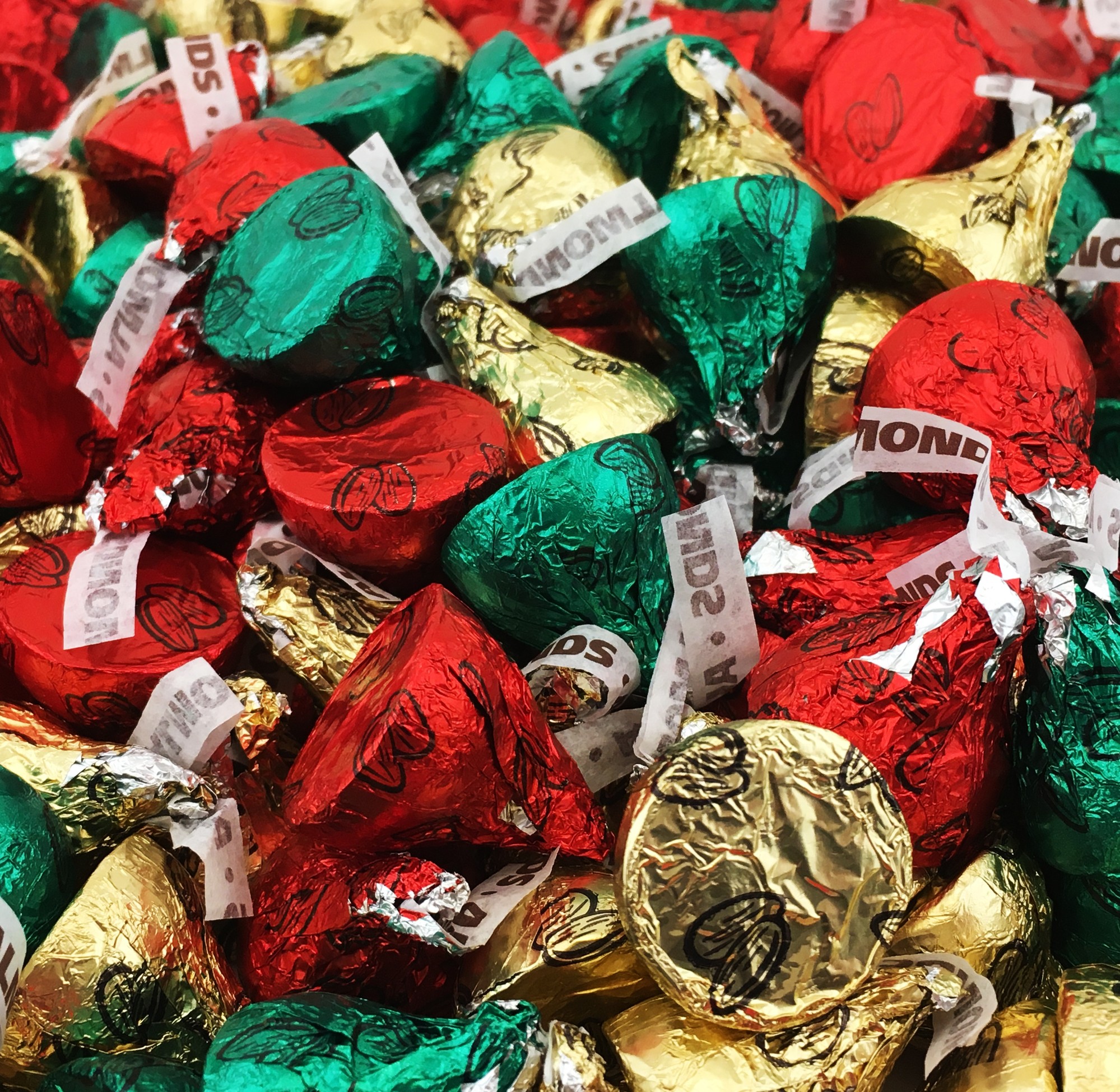 Hershey's Kisses Mix, Milk Chocolate with Almond, Red Gold Green Foils (Pack of 2 Pounds)