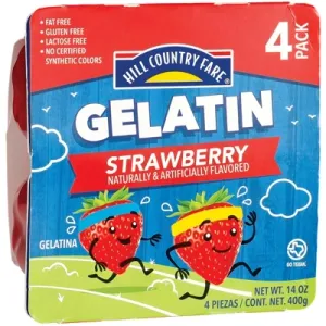 Strawberry Gelatin Cup: WATER, SUGAR, GELATIN, TRISODIUM CITRATE, CITRIC ACID, ASCORBIC ACID (COLOR RETENTION), NATURAL AND ARTIFICIAL FLAVORS, COLORS (CARMINE, TURMERIC).