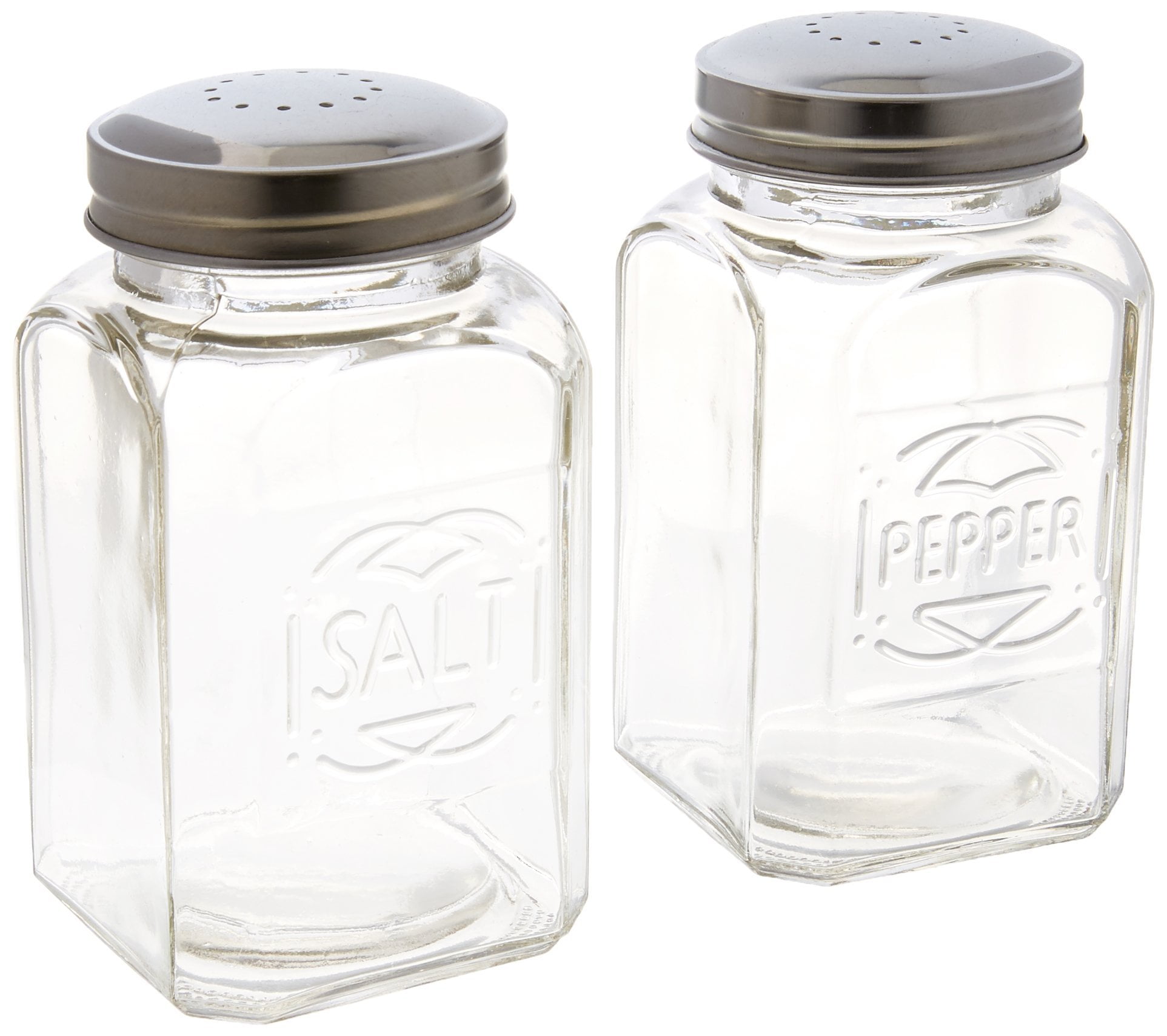 Home Essentials & Beyond Salt and Pepper Shakers Set of 2 Clear Glass Salt and Pepper Shaker Holders with Stainless Steel Lids.