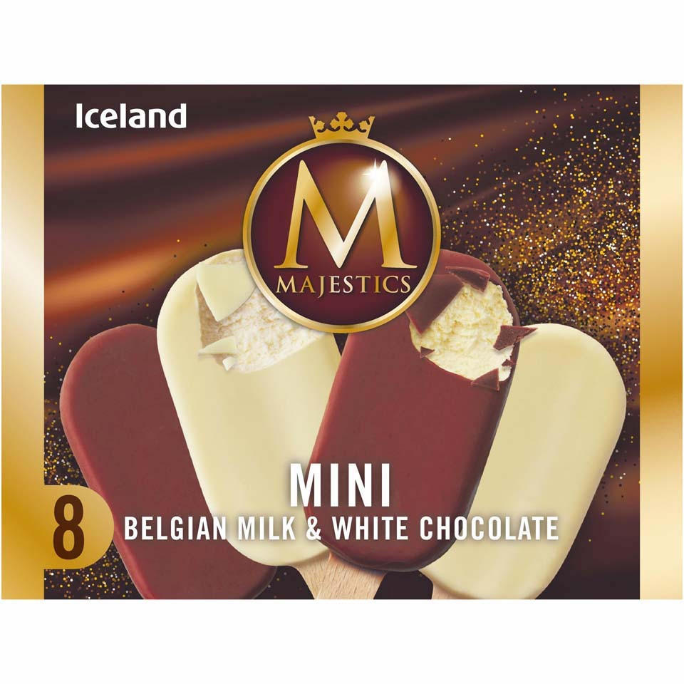 Mini Belgian Milk Chocolate Majestics: Reconstituted Skimmed Milk, Belgian Milk Chocolate Coating, Sugar, Cocoa Butter, Dried Whole Milk, Cocoa Mass, Vegetarian Whey Powder (Milk), Coconut Fat, Emulsifiers: Soya Lecithins, Polyglycerol Polyricinoleate, Anhydrous Milk Fat, Flavouring), Sugar, Coconut Oil, Glucose Syrup, Vegetarian Whey Powder (Milk), Emulsifier: Mono- And Diglycerides Of Fatty Acids, Stabilisers: Locust Bean Gum, Guar Gum, Dried Skimmed Milk, Flavourings, Salt, Exhausted Vanilla Powder, Colour: Carotenes, Mini Belgian White Chocolate Majestics: Reconstituted Skimmed Milk, Belgian White Chocolate Coating, Cocoa Butter, Dried Skimmed Milk, Anhydrous Milk Fat, Coconut Fat, Emulsifiers: Polyglycerol Polyricinoleate, Soya Lecithins, Flavouring, Colour: Carotenes