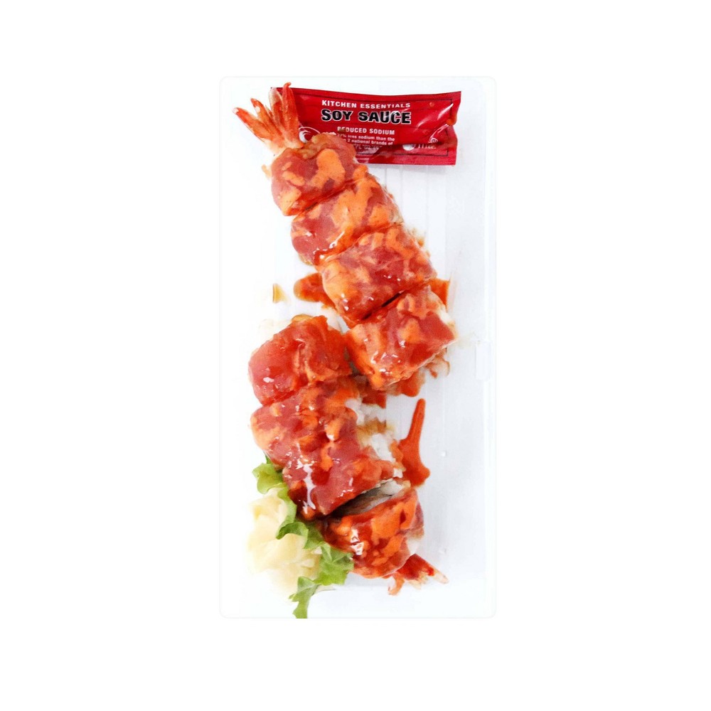 SUSHI RICE (WATER, WHITE RICE, SUSHI VINEGAR (SUGAR, RICE VINEGAR, WATER, SALT, CITRIC ACID, KELP EXTRACT (KELP EXTRACT, SUGAR ALCOHOL, HYDROGENATED STARCH HYDROLYSATES, ALCOHOL, SALT, XANTHAN GUM))), SHRIMP TEMPURA (FARM RAISED SHRIMP, WHEAT FLOUR, STARCH, EGG ALBUMEN POWDER, SALT, BAKING POWDER, WHOLE EGG POWDER, WHEAT PROTEIN, FOOD COLOR (VITAMIN B2), PRE-FRIED IN NON-GMO PALM OIL), RAW TUNA, VEGAN SPICY MAYO (VEGAN MAYO (EXPELLER-PRESSED CANOLA OIL, WATER, MODIFIED FOOD STARCHES, WHITE DISTILLED VINEGAR, SUGAR, GARLIC PUREE (GARLIC, CITRIC ACID), LEMON JUICE CONCENTRATE, PEA PROTEIN, SALT, SPICE, TAPIOCA MALTODEXTRIN, FRUIT AND VEGETABLE JUICE (COLOR)), RED CHILI PUREE (RED JALAPENO PEPPERS, CITRIC ACID), WATER, DEXTROSE, SESAME OIL, SOY SAUCE (WATER, SOYBEANS, WHEAT, SALT), CANE SUGAR, DISTILLED VINEGAR, SALT, CAYENNE PEPPER, MODIFIED CORN STARCH, LEMON JUICE CONCENTRATE, RICE VINEGAR, YEAST EXTRACT, CULTURED DEXTROSE, XANTHAN GUM), PICKLED GINGER (GINGER, WATER, SALT, SUGAR, VINEGAR), TERIYAKI SAUCE (SUGAR, WATER, SOY SAUCE [WATER, SOYBEANS, SALT, SUGAR], MODIFIED FOOD STARCH, PRUNE CONCENTRATE JUICE, SALTED SAKE [SALTED RICE WINE], SALT, LEMON CONCENTRATE JUICE, ONION POWDER, NATURAL FLAVOR, XANTHAN GUM), SESAME SEEDS, SEAWEED, LETTUCE, SOY SAUCE