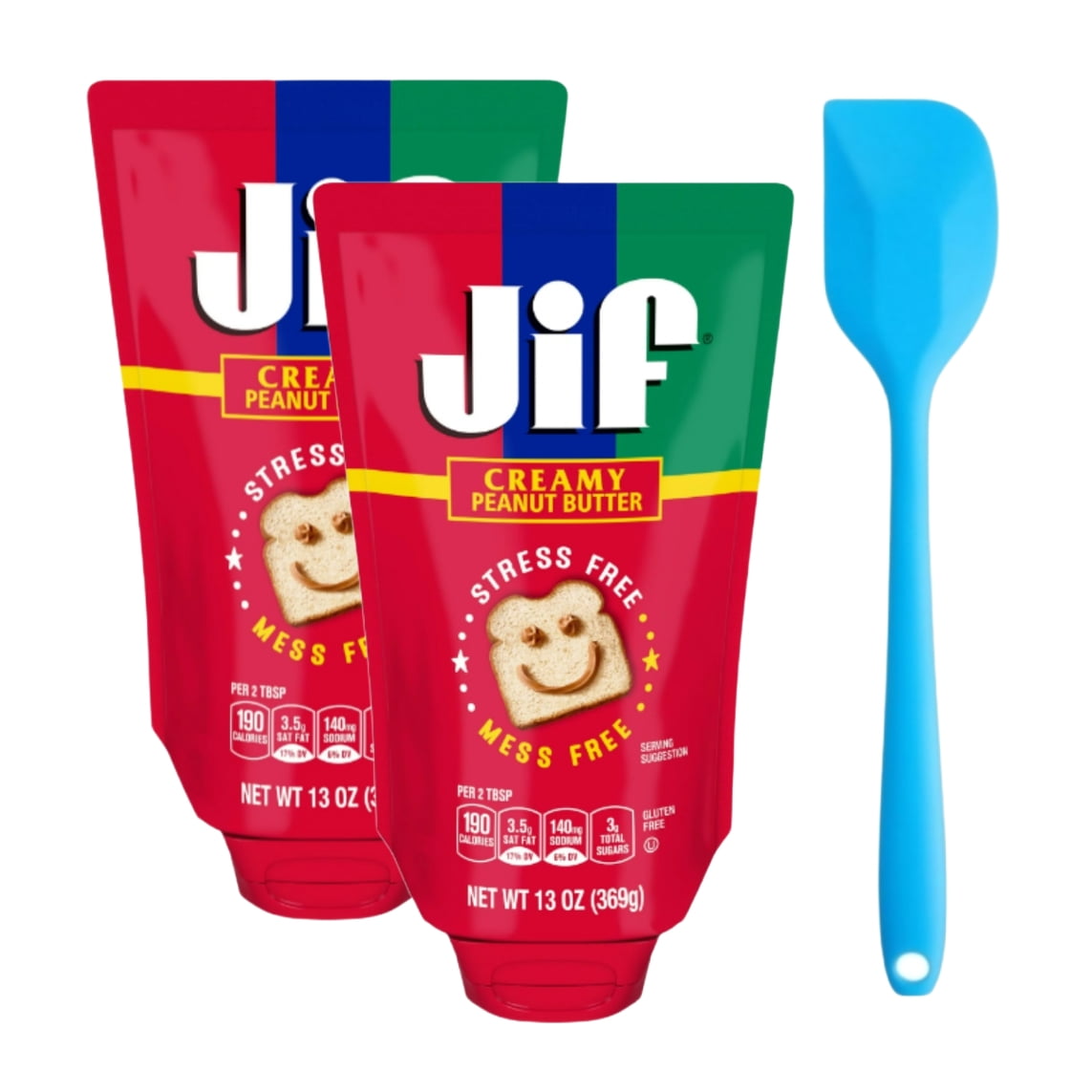 Jif Squeeze Creamy Peanut Butter, 13 oz. - Smooth, Creamy Texture, Portable Peanut Butter Pouch (2 pack) and 8in Silicone Spatula (Color Varies)