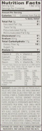 SOLUBLE CORN FIBER, SOY PROTEIN ISOLATE, ROLLED OATS, SUGAR, CEREAL (RICE, WHOLE GRAIN WHEAT, SUGAR, WHEAT BRAN, SOLUBLE WHEAT FIBER, SALT, MALT FLAVORING, VITAMIN B1 [THIAMIN MONONITRATE], VITAMIN B2 [RIBOFLAVIN]), FRUCTOSE, SEMISWEET CHOCOLATE (CHOCOLATE, SUGAR, DEXTROSE, SOY LECITHIN, ARTIFICIAL FLAVOR), VEGETABLE OIL (HYDROGENATED AND/OR PARTIALLY HYDROGENATED PALM KERNEL, PALM, CANOLA AND/OR COCONUT OIL), CORN SYRUP, CHICORY ROOT FIBER, RICE, DEXTROSE, CONTAINS 2% OR LESS OF COCOA (PROCESSED WITH ALKALI), CHOCOLATE, SORBITOL, GLYCERIN, WHEY, NATURAL AND ARTIFICIAL FLAVORS, SOY LECITHIN, SALT, POLYSORBATE 60, SORBITAN MONOSTEARATE, NIACINAMIDE, BHT (PRESERVATIVE), ALMOND FLOUR, PEANUT FLOUR, MALT FLAVOR, DISTILLED MONOGLYCERIDES, VITAMIN B6 (PYRIDOXINE HYDROCHLORIDE), REDUCED IRON, VITAMIN B2 (RIBOFLAVIN).