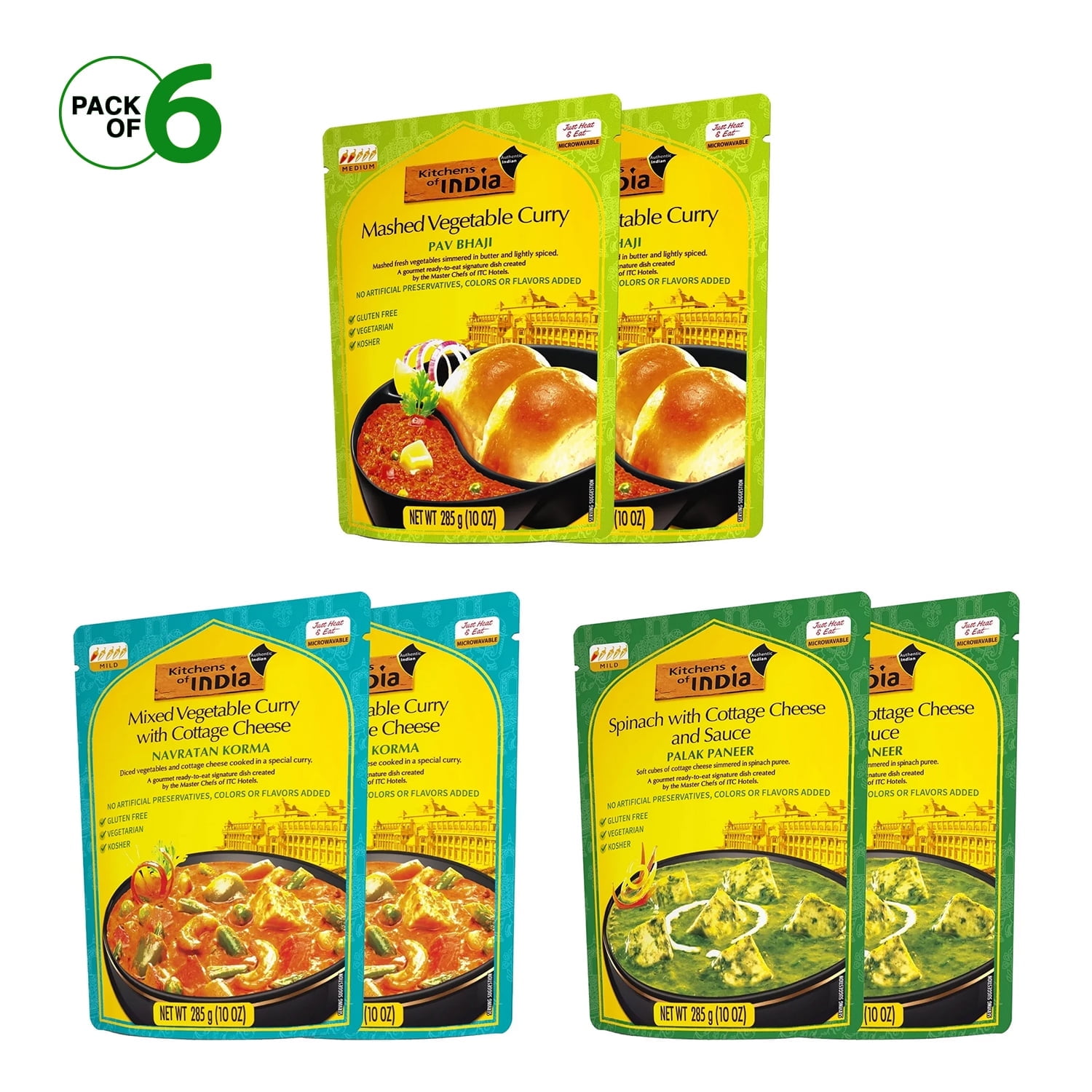 Kitchens of India Ready-to-Eat Variety Pack Indian Dish No Preservatives Added 10 oz. (Navratan Korma, Pav Bhaji, Cottage Cheese Palak Paneer - Pack of 6)