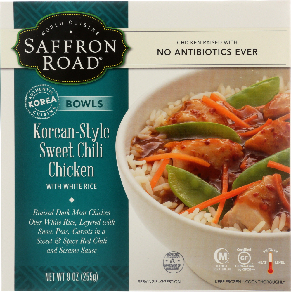 KOREAN-INSPIRED SWEET CHILI CHICKEN BOWL WITH WHITE RICE BRAISED DARK MEAT CHICKEN, SNOW PEAS AND CARROTS IN A SWEET & SPICY RED CHILI SESAME SAUCE, KOREAN-INSPIRED SWEET CHILI CHICKEN