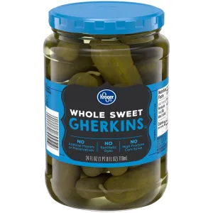 Small, whole sweet pickles offer crisp, firm texture with a pronounced sweet-tart flavor, commonly used for snacking, in salads, sandwiches, or as part of relish and charcuterie. Reviewer themes note consistent crunch and sweetness, occasional variability in firmness or size, and usefulness for quick, ready-to-serve garnishes and versatile meal additions.