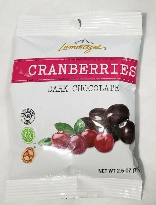 Dark Chocolate (Sugar, Unsweetened Chocolate, Cocoa Butter, Soy Lecithin (Emulsifier), Polyglycerol Polyricinoleate (Emulsifier), Salt, Vanilla Extract), Cranberries, Sugar, Sunflower Oil, Water, Corn Syrup, Gum Arabic, Potassium Sorbate Preservat