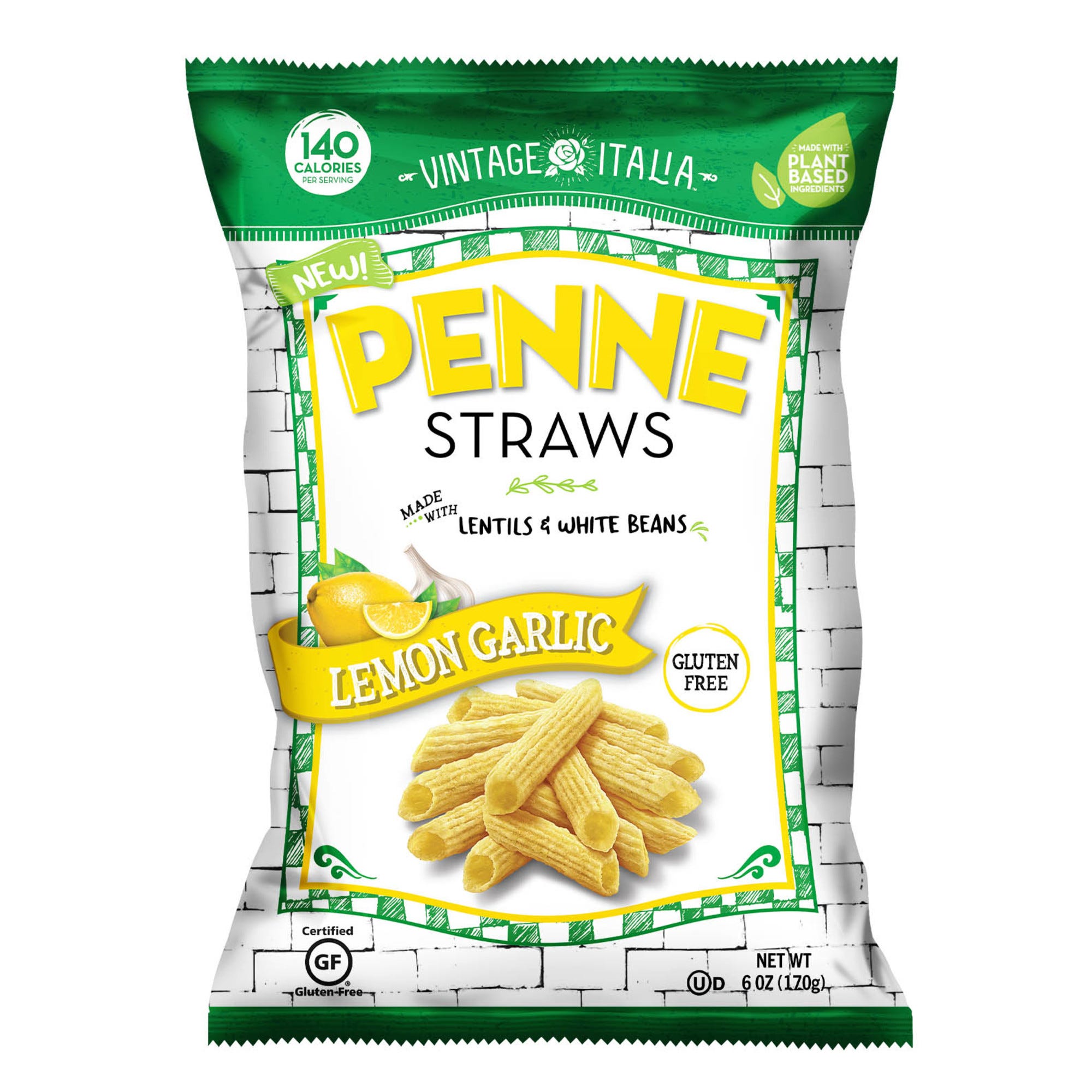 PENNE STRAWS (LENTIL FLOUR, CORN FLOUR, RICE FLOUR, POTATO STARCH, PEA STARCH, CANNELLINI BEAN FLOUR, SALT, SUGAR, GREEN PEPPER POWDER), SUNFLOWER OIL, LEMON GARLIC SEASONING (SUGAR, MALTODEXTRIN, GARLIC POWDER, NATURAL BUTTER FLAVOR, SALT, CITRIC ACID, LEMON OIL, EXTRACTIVES OF TURMERIC)