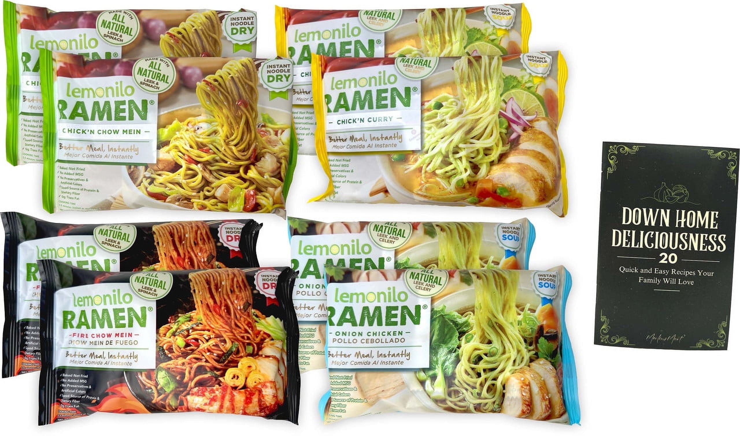 Lemonilo Ramen All Natural Instant Dry Noodles 4 Flavor (2) each: Chick'n Chow Mein, Chick'n Curry, Fire Chow Mein, Onion Chicken (2.65 Ounces) + MerlinsMart Zine