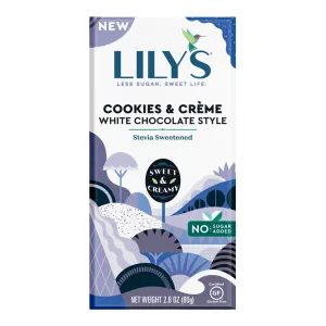 Lily's Cookies and Crème White Chocolate Style Bars are a modern, thoughtful, and delicious treat. Made with white chocolate and crème, these bars are a guilt-free indulgence as they contain no added sugar. Additionally, they are kosher-certified, catering to various dietary preferences. People appreciate the high-quality ingredients and the fact that the bars are suitable for those watching their sugar intake. With their unique and flavorful combination, these bars are a delightful option for anyone craving a sweet and satisfying snack.
