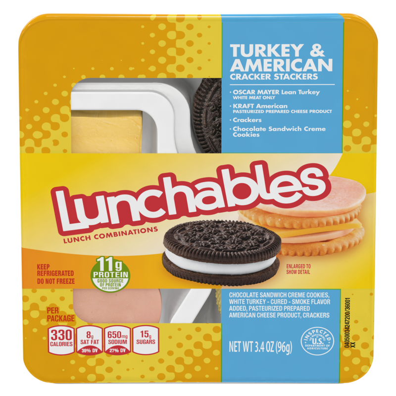 Calcium, Iron, Potassium, Chocolate Sandwich Creme Cookie (sugar, Unbleached Enriched Flour [wheat Flour, Niacin, Reduced Iron, Thiamine Mononitrate, Riboflavin, Folic Acid], Palm And Soybean Oil, Dextrose, Cocoa [processed With Alkali], Contains 2% Or Less Of: High Fructose Corn Syrup, Cornstarch, Sodium Bicarbonate [leavener], Salt, Artificial Flavors, Soy Lecithin, Chocolate), Contains: Wheat, Soy. White Turkey - Cured - Smoke Flavor Added (white Turkey, Water, Potassium Lactate, Contains Less Than 2% Of Modified Cornstarch, Dextrose, Salt, Carrageenan, Sodium Phosphates, Sodium Diacetate, Potassium Chloride, Sodium Ascorbate, Natural And Artificial Flavor, Sodium Nitrite, Smoke Flavor), American Pasteurized Prepared Cheese Product (milk, Water, Milk Protein Concentrate, Milkfat, Whey Protein Concentrate, Sodium Citrate, Whey, Salt, Lactic Acid, Sorbic Acid, Cheese Culture, Enzymes, Oleoresin Paprika [color], Annatto Extract [color], With Sunflower Lecithin Added For Slice Separation), Contains: Milk. Crackers (enriched Flour [wheat Flour, Niacin, Reduced Iron, Thiamine Mononitrate, Riboflavin, Folic Acid], Palm Oil, Sugar, Salt, Baking Soda, Whey [from Milk], Soy Lecithin, Natural Flavor). Contains Wheat, Milk, Soy.