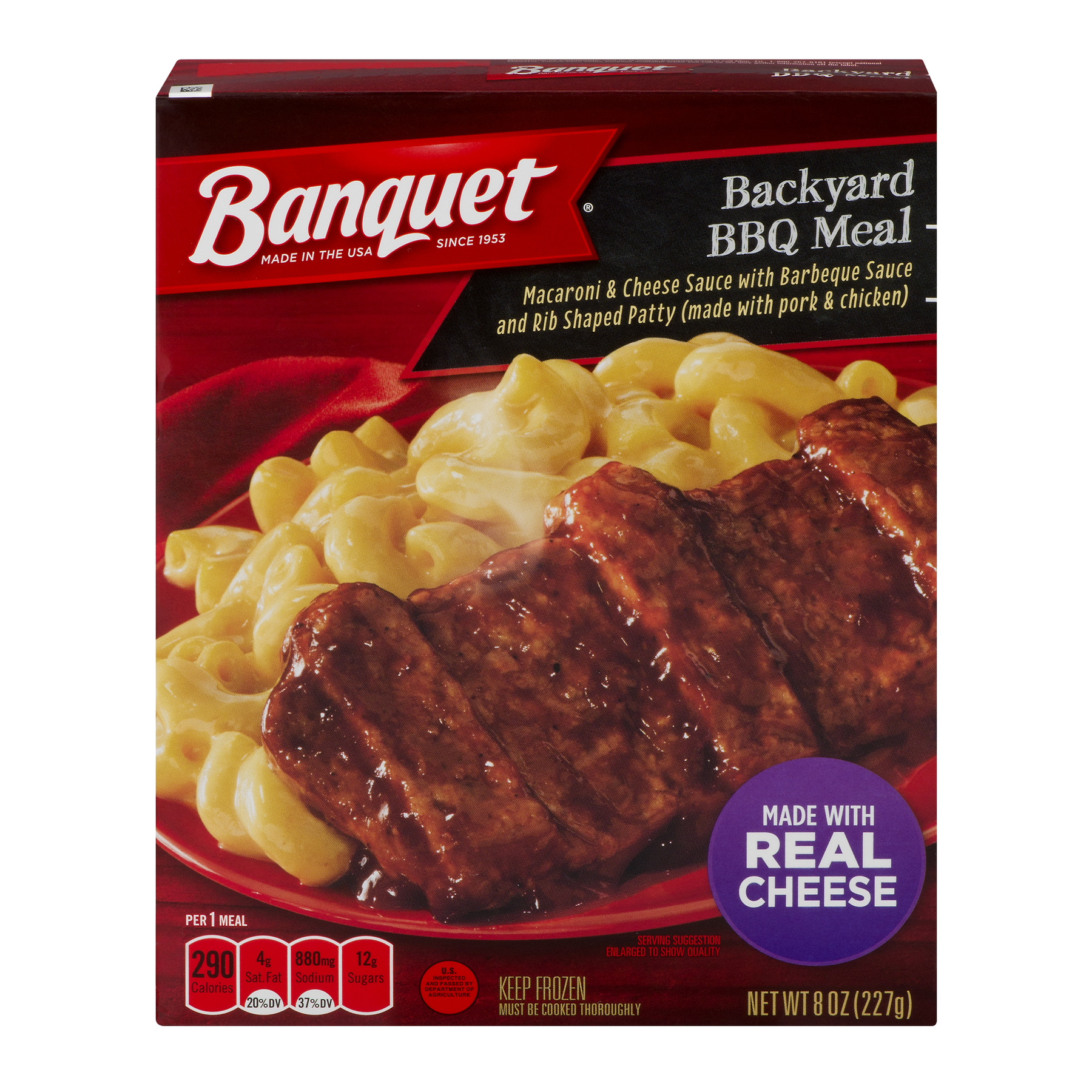 MACARONI & CHEESE SAUCE WITH BARBEQUE SAUCE AND RIB SHAPED PATTY (MADE WITH PORK & CHICKEN) BACKYARD BBQ MEAL, BBQ is available at 1 retailer
