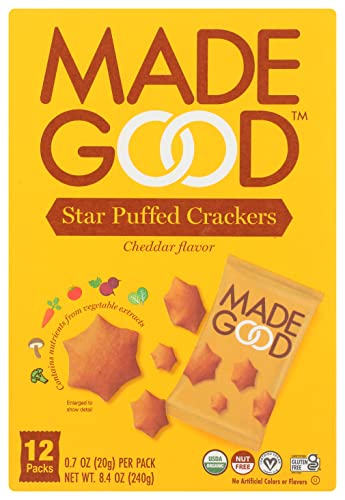 Light, star-shaped puffed crackers deliver a mild cheddar taste and an airy, crunchy texture. Commonly used as a kid-friendly snack, lunchbox filler, or on-the-go bite, reviewers praise the convenient size and consistent crispness while noting occasional crumbs and a relatively mild, not overpowering cheese flavor. Also convenient for adult snacking.
