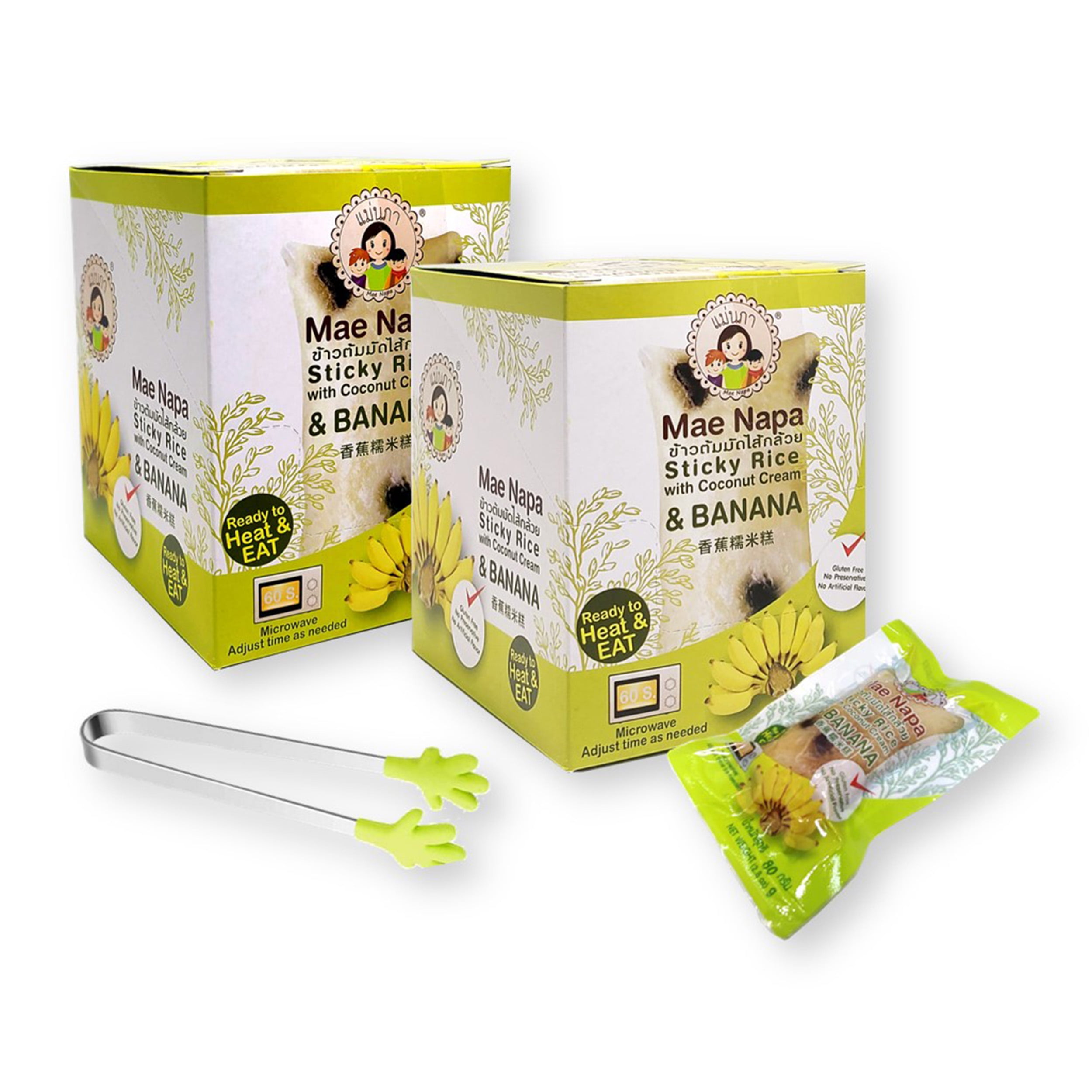 Mae Napa Thai Sticky Rice wtih BANANA Flling - Khao Tom Mud - Ready to Heat and Eat (80 g X 6 X 2) with Bonus Mini Silicone Tongs (13-Pc Set)