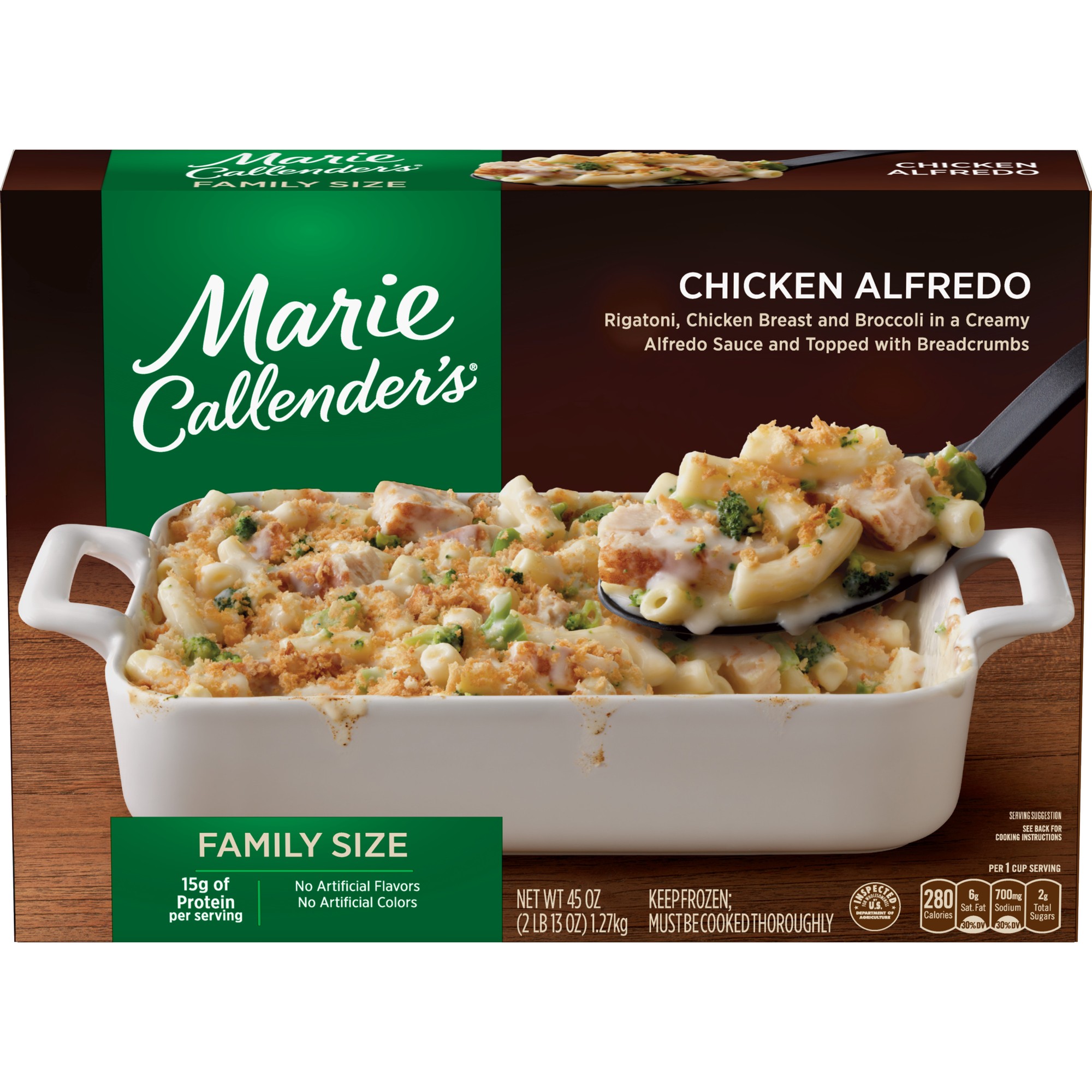 COOKED ENRICHED MACARONI PRODUCT (WATER, SEMOLINA [ MILLED WHEAT, NIACIN, FERROUS SULFATE, THIAMINE MONONITRATE, RIBOFLAVIN, FOLIC ACID], EGG WHITES), WATER, COOKED WHITE MEAT CHICKEN (WHITE MEAT CHICKEN, WATER, ISOLATED SOY PROTEIN PRODUCT [ ISOLATED SOY PROTEIN, MODIFIED FOOD STARCH, STARCH, CARRAGEENAN WITH LESS THAN 2% SOY LECITHIN], SALT, CHICKEN BROTH POWDER [ MALTODEXTRIN, CHICKEN BROTH, SALT, DISODIUM INOSINATE & DISODIUM GUANYLATE], AUTOLYZED YEAST EXTRACT, FLAVORINGS), BROCCOLI, CREAM, PARMESAN CHEESE (PASTEURIZED PART-SKIM MILK, CHEESE CULTURES, SALT, ENZYMES), BREADCRUMBS (WHEAT FLOUR, CONTAINS 2% OR LESS OF EACH OF THE FOLLOWING: SUGAR, PARTIALLY HYDROGENATED SOYBEAN OIL WITH TBH1, SALT, YEAST, AND CALCIUM PROPIONATE), BUTTER (CREAM, SALT), SHERRY (CONTAINS SULFITES), MODIFIED FOOD STARCH, CHEESE SEASONING (PARMESAN CHEESE [ PASTEURIZED MILK, CULTURES, SALT, ENZYMES], WATER, SODIUM CITRATE [ EMULSIFIER]), GARLIC (GARLIC, CITRIC ACID), SALT, WHEAT FLOUR, DATEM, SPICE.