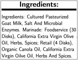 Cultured Pasteurized Goat Milk, Salt, Microbial Enzymes, Marinade: Organic Canola Oil, California Extra Virgin Olive Oil, Herbs And Spices