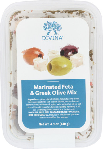 PITTED OLIVES (GREEK OLIVES, KALAMATA), FETA CHEESE (SHEEP AND GOAT MILK, SALT, CALCIUM CHLORIDE, MICROBIAL RENNET, STARTER CULTURE), SUNFLOWER OIL, SPICES, EXTRA VIRGIN OLIVE OIL, SEA SALT, CITRIC ACID (ACIDITY REGULATOR), LACTIC ACID (ACIDITY REGULATOR), ACETIC ACID (ACIDITY REGULATOR), ASCORBIC ACID (ANTIOXIDANT).