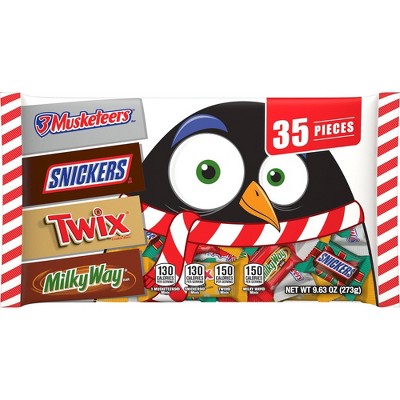 3 Musketeers. Snickers. Twix. Milky Way3 Musketeers Minis: Milk Chocolate (Sugar, Chocolate, Cocoa Butter, Skim Milk, Lactose, Milkfat, Soy Lecithin), Sugar, Corn Syrup, Palm Oil, Cocoa Powder Pressed With Alkali, Less Than 1.5% - Salt, Egg Whites, Natural And Artificial Flavors. Snickers Minis: Milk Chocolate (Sugar, Cocoa Butter, Chocolate, Skim Milk, Lactose, Milkfat, Soy Lecithin), Peanuts, Corn Syrup, Sugar, Palm Oil, Skim Milk, Lactose, Salt, Egg Whites, Artificial Flavor. Twix Minis: Milk Chocolate (Sugar, Cocoa Butter, Chocolate, Skim Milk, Lactose, Milkfat, Soy Lecithin, Pgpr, Artificial Flavors), Enriched Wheat Flour (Wheat Flour, Niacin, Reduced Iron, Thiamine Mononitrate, Riboflavin, Folic Acid), Sugar, Palm Oil, Corn Syrup, Skim Milk, Dextrose, Less Than 2% - Salt, Cocoa Powder, Soy Lecithin, Modified Corn Starch, Baking Soda, Artificial Flavor. Milky Way Minis: Milk Chocolate (Sugar, Cocoa Butter, Skim Milk, Chocolate, Lactose, Milkfat, Soy Lecithin, Artificial Flavor), Corn Syrup, Sugar, Palm Oil, Skim Milk, Less Than 2% - Milkfat, Cocoa! Powder Processed With Alkali, Barley Malt! Extract, Lactose, Salt, Egg Whites, Chocolate, Artificial Flavor.