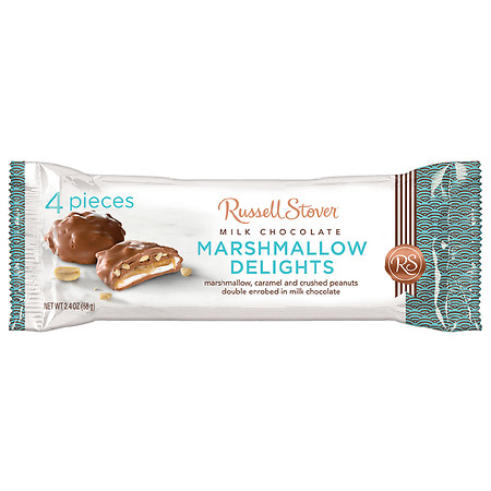 MARSHMALLOW, CARAMEL AND CRUSHED PEANUTS DOUBLE ENROBED IN MILK CHOCOLATE DELIGHTS, MARSHMALLOW DELIGHTS