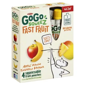 MATERNE, GOGO SQUEEZ, FAST FRUIT SQUEEZABLE POUCHES, APPLE, MANGO, PINEAPPLE, BANANA, APPLE, MANGO, PINEAPPLE, BANANA