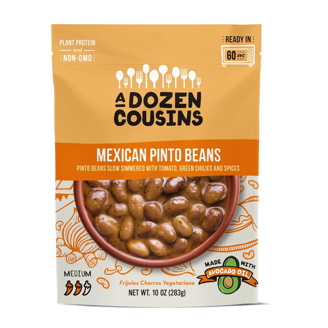 MEDIUM MEXICAN COWBOY PINTO BEANS SLOW SIMMERED WITH TOMATO, GREEN CHILIES AND SPICES, MEDIUM MEXICAN COWBOY PINTO BEANS