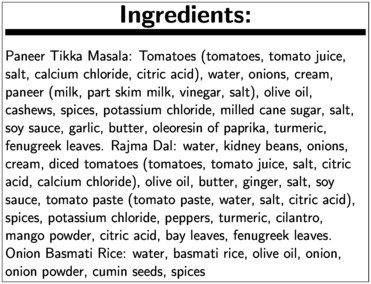 Paneer Tikka Masala: Tomatoes (Tomatoes, Tomato Juice, Salt, Calcium Chloride, Citric Acid), Water, Onions, Paneer (Milk, Part Skim Milk, Vinegar, Salt), Cream, Non-fat Milk Powder, Olive Oil, Spices, Cashews, Canola Oil, Garlic, Butter, Sugar, Salt, Ghee (Clarified Butter), Paprika Oleoresin, Coriander Leaves, Turmeric, Rajma: Water, Kidney Beans, Tomatoes (Tomatoes, Tomato Juice, Salt, Citric Acid, Calcium Chloride), Tomato Paste (Tomato Paste, Water, Salt, Citric Acid), Citric Acid, Mango Powder, Onion, Basmati Rice: Water, Basmati Rice, Cumin Seeds