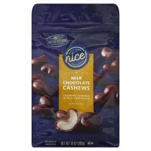 Milk Chocolate Covered Cashews (Milk Chocolate Coating (Sugar, Cocoa Butter, Chocolate Liquor, Milk, Soy Lecithin And Vanilla Extract), Cashews (Cashews, Canola Oil), Corn Syrup, Tapioca Dextrin, Confectioner's Glaze)