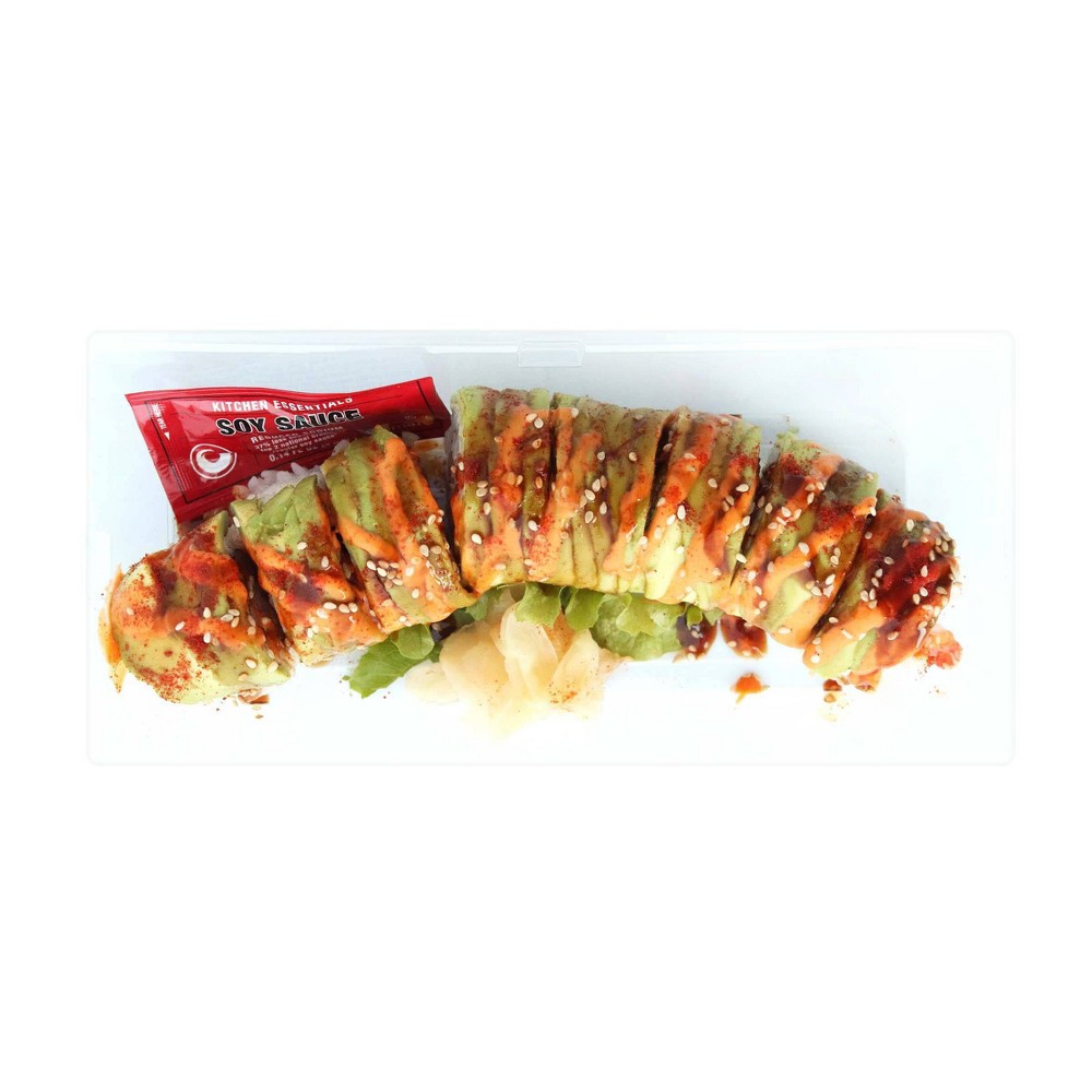 QUINOA BROWN RICE (WATER, BROWN RICE, SUSHI VINEGAR (SUGAR, RICE VINEGAR, WATER, SALT, CITRIC ACID, KELP EXTRACT (KELP EXTRACT, SUGAR ALCOHOL, HYDROGENATED STARCH HYDROLYSATES, ALCOHOL, SALT, XANTHAN GUM)), RED QUINOA), AVOCADO, CRABSTICK (FISH PROTEIN (ALASKA POLLOCK AND/OR PACIFIC WHITING), WATER, POTATO STARCH, CANE SUGAR, EGG WHITE, TAPIOCA STARCH, NATURAL FLAVOR (CRAB JUICE), POTASSIUM CHLORIDE, SALT, YEAST EXTRACT, COLOR ADDED (PAPRIKA, TOMATO, LYCOPENE)), VEGAN SPICY MAYO (VEGAN MAYO (EXPELLER - PRESSED CANOLA OIL, WATER, MODIFIED FOOD STARCHES, WHITE DISTILLED VINEGAR, SUGAR, GARLIC PUREE (GARLIC, CITRIC ACID), LEMON JUICE CONCENTRATE, PEA PROTEIN, SALT, SPICE, TAPIOCA MALTODEXTRIN, FRUIT AND VEGETABLE JUICE (COLOR)), RED CHILI PUREE (RED JALAPENO PEPPERS, CITRIC ACID), WATER, DEXTROSE, SESAME OIL, SOY SAUCE (WATER, SOYBEANS, WHEAT, SALT), CANE SUGAR, DISTILLED VINEGAR, SALT, CAYENNE PEPPER, MODIFIED CORN STARCH, LEMON JUICE CONCENTRATE, RICE VINEGAR, YEAST EXTRACT, CULTURED DEXTROSE, XANTHAN GUM), PICKLED GINGER (GINGER, WATER, SALT, SUGAR, VINEGAR), BBQ SAUCE (SOY SAUCE [WATER, WHEAT, SOYBEANS, SALT], CANE SUGAR, DEXTROSE, SALTED SAKE [RICE, KOJI {ASPERGILLUS ORYZAE}, SALT], CORN STARCH, CARAMEL COLOR, YEAST EXTRACT, XANTHAN GUM), SESAME SEEDS, SEAWEED, LETTUCE, CHILI PEPPER.