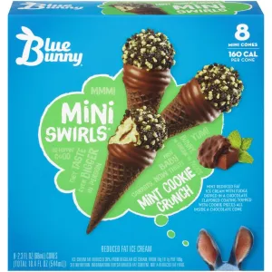 MINT COOKIE CRUNCH MINT REDUCED FAT ICE CREAM WITH FUDGE DIPPED IN A CHOCOLATE FLAVORED COATING TOPPED WITH COOKIE PIECES ALL INSIDE A CHOCOLATE CONE, MINT COOKIE CRUNCH