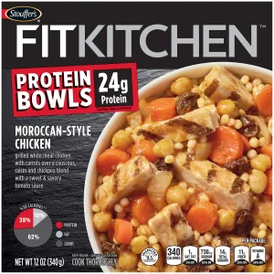 INGREDIENTS: COOKED, GRILLED WHITE MEAT CHICKEN (WHITE MEAT CHICKEN, WATER, ISOLATED SOY PROTEIN, MODIFIED FOOD STARCH, SEASONING [DRIED CHICKEN BROTH, CHICKEN POWDER, NATURAL FLAVOR], SODIUM PHOSPHATE, MALTODEXTRIN, SALT), COOKED ENRICHED COUSCOUS (WATER, SEMOLINA WHEAT FLOUR, NIACIN, FERROUS SULFATE, THIAMINE MONONITRATE, RIBOFLAVIN, FOLIC ACID), CARROTS, WATER, CHICKPEAS (WATER, CHICKPEAS, SALT), TOMATO PUREE (WATER, TOMATO PASTE), RAISINS, 2% OR LESS OF ONIONS, CORN STARCH, OLIVE OIL, GARLIC, GINGER PUREE, SALT, SPICES, POTASSIUM CHLORIDE, PAPRIKA, CHILI PEPPER, TURMERIC.