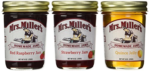 Mrs. Miller's Amish Homemade Quince Jelly, Strawberry Jam & Red Raspberry Jam Variety Pack (One of Each) 8 oz/226g - Pack of 3 (Boxed)