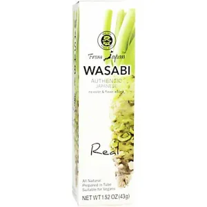 Bold, sinus-clearing heat and a fresh, green flavor characterize this wasabi paste, with a smooth yet slightly grainy texture that disperses quickly. Commonly used as a condiment for sushi, sashimi, noodles and dipping sauces. Reviewers praise authentic taste and convenient tube packaging, while noting variable intensity and consistency between batches.
