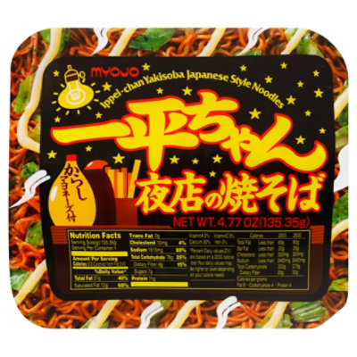 Noodles: Wheat Flour, Palm Oil, Salt, Hydrolyzed Protein (Sardine, Bonito, Tuna), Soy Sauce (Water, Soybeans, Wheat, Salt), Calcium Carbonate, Sugar, Monosodium Glutamate, Caramel Color, Sodium Carbonate, Alginic Acid, Potassium Carbonate, Sodium Metaphosphate, Vitamin E, Sodium Polyphosphate, Guar Gum. Sauce: Worcester Sauce (Vinegar, Sugar, Tomato, Onion, Mushroom, Apple, Salt, Spices, Hydrolyzed Soybean Protein, Water), Sugar, Vegetable Oil (Rapeseed Oil, Rice Oil, Soybean Oil), Caramel Color, Hydrolyzed Protein (Bonito, Sardine, Tuna, Corn), High Fructose Syrup, Yeast Extract, Salt, Natural and Artificial Flavor, Monosodium Glutamate, Scallop Extract, Disodium Inosinate, Vinegar, Licorice Extract, Garlic. Mustard Mayonnaise: Vegetable Oil (Rapeseed Oil, Soybean Oil), Vinegar, Egg Yolk, Salt, Sugar, Mustard, Monosodium Glutamate. Dried Vegetables: Cabbage (Cabbage, Lactose). Garnish: Dried Worcester Sauce (Potato Starch, Caramel Color, Spices, Salt, Worcester Sauce, Tomato, Natural and Artificial Flavor), Spices, Dried Seaweed.