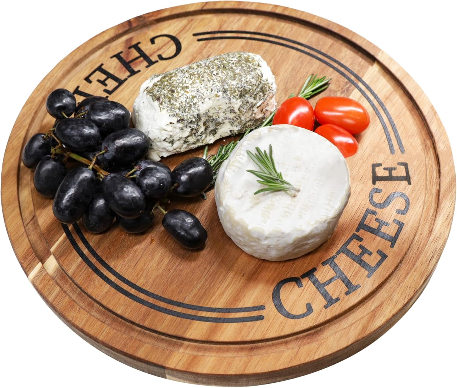 Myst Design Acacia Wood Cheese Board with Stainless Steel Knife, Elevate your Presentation with c and Adaptable Circular Charcuterie Board Designed for Variety of Cheeses, Meats, and Crackers