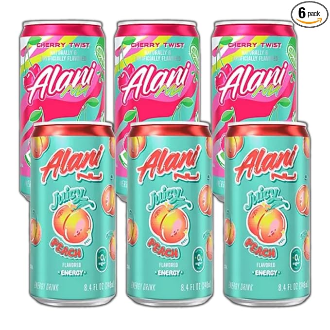 New Alani Energy Drinks Cherry Twist, Juicy Peach Variety Pack, Sugar Free, 8.4oz Mini Cans (6 pack)