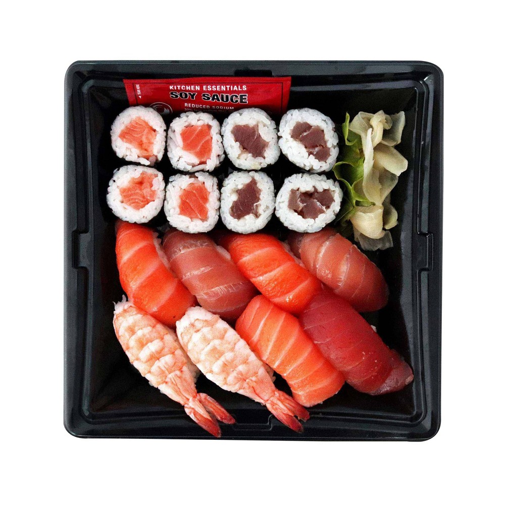 SUSHI RICE (WATER, WHITE RICE, SUSHI VINEGAR (SUGAR, RICE VINEGAR, WATER, SALT, CITRIC ACID, KELP EXTRACT (KELP EXTRACT, SUGAR ALCOHOL, HYDROGENATED STARCH HYDROLYSATES, ALCOHOL, SALT, XANTHAN GUM))), RAW TUNA, RAW SALMON, PICKLED GINGER (GINGER, WATER, SALT, SUGAR, VINEGAR), COOKED SHRIMP NIGIRI (SHRIMP, SALT.), LETTUCE, SEAWEED. SOY SAUCE