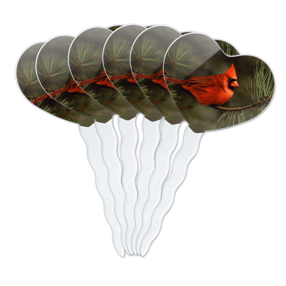Northern Cardinal Red Pine Perch Heart Love Cupcake Picks Toppers Decoration Set of 6