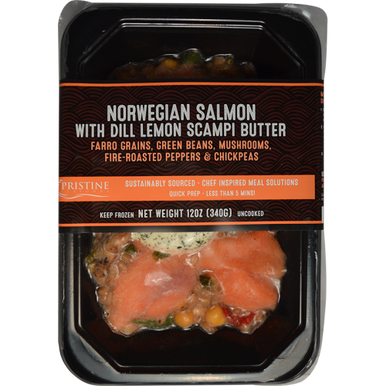 SALMON, FARRO, GARBANZO BEANS, GREEN BEANS, BUTTON MUSHROOM, MIXED PEPPERS AND ONION, LEMON DILL SCAMPI BUTTER PUCK (EUROPEAN STYLE BUTTER BLEND (VEGETABLE OIL BLEND (PALM AND PALM KERNAL OIL, SOYBEAN OIL), SKIM MILK, BUTTER (CREAM, SALT), CONTAINS LESS THAN 2% OF NATURAL FLAVOR, VITAMIN A PALMITATE ADDED, BETA CAROTENE (COLOR), SALT), GARLIC, DILL WEED, ONION, PINOT GRIGIO WINE (PINOT GRIGIO WINE, SULFITES), LEMON ZEST (CHOPPED LEMON PEELS, CANE SUGAR, NATURAL LEMON FLAVOR), SEA SALT, EXTRA VIRGIN OLIVE OIL, TARRAGON LEAVES, KEY WEST LEMON JUICE (FILTERED WATER, LEMON JUICE CONCENTRATE, LEMON OIL), PEPPERCORN MELANGE (BLACK PEPPERCORNS, WHITE PEPPERCORNS, PINK PEPPERCORNS (SCHINUS TEREBINTHIFOLIUS), AND GREEN PEPPERCORNS), PEPPERCORN MEDLEY.