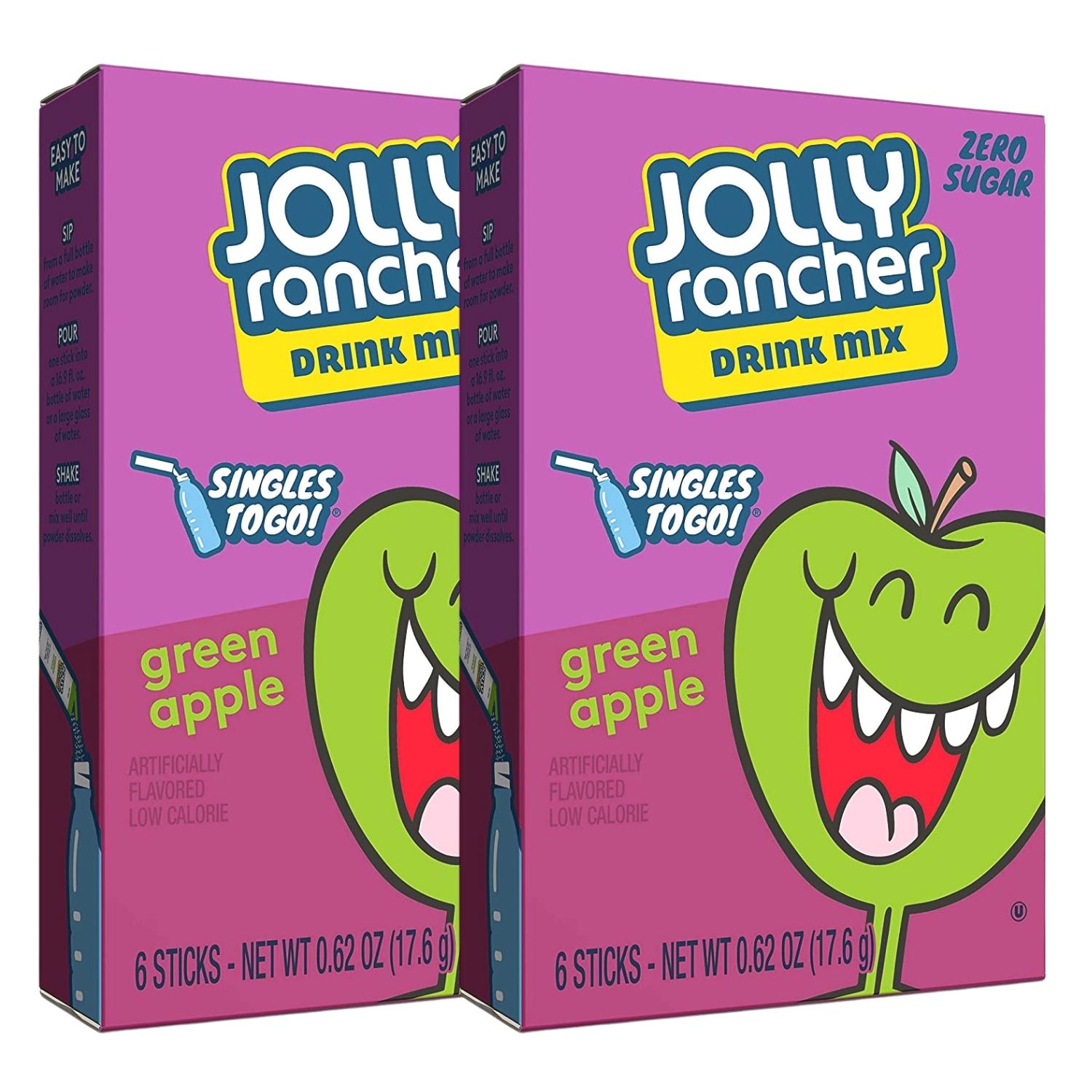 NS Jolly Rancher Green Apple Singles to Go Water Drink Mix, Sugar-free, Caffeine-free & Artificially Flavored, 2 Boxes - 6 Sachet per Box - 12 Total Servings