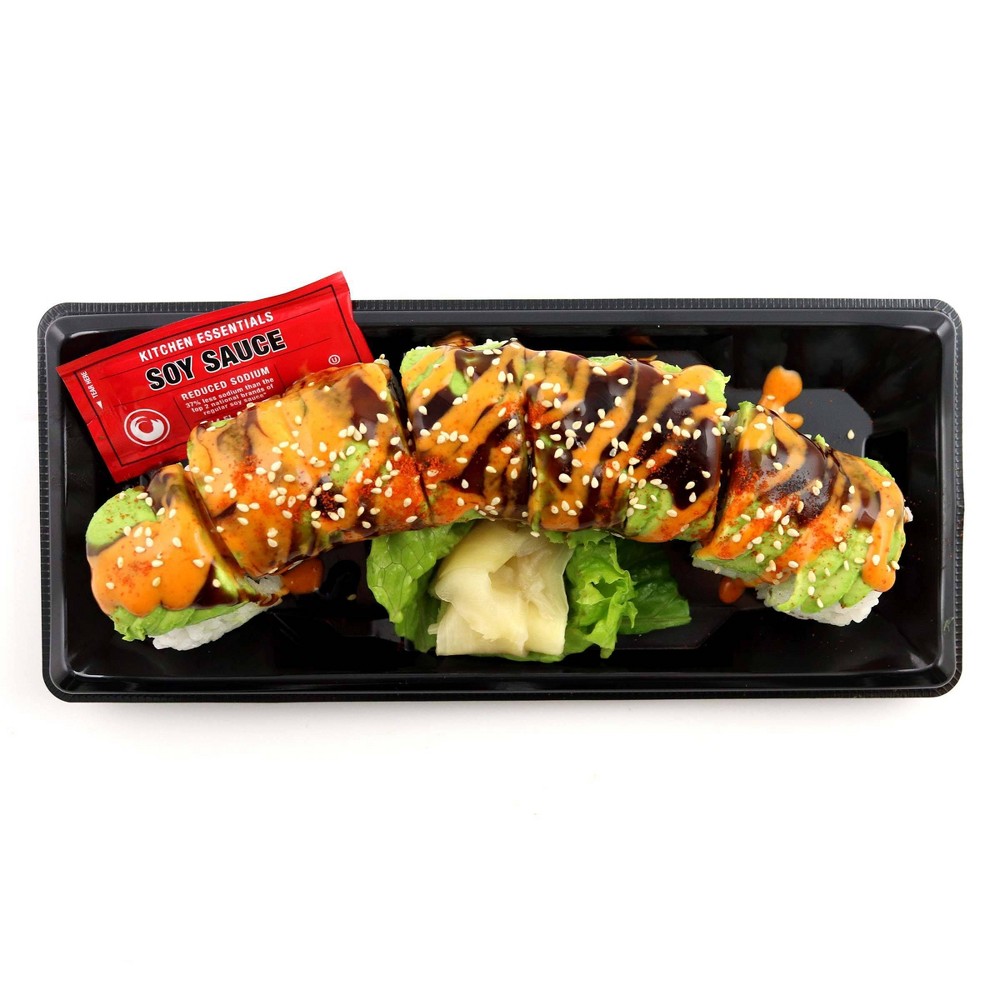 SUSHI RICE (WATER, WHITE RICE, SUSHI VINEGAR (SUGAR, RICE VINEGAR, WATER, SALT, CITRIC ACID, KELP EXTRACT (KELP EXTRACT, SORBITOL, MALTITOL, HYDROGENATED STARCH HYDROLYSATES, ALCOHOL, SALT, XANTHAN GUM))), AVOCADO, CRABSTICK (FISH PROTEIN (ALASKA POLLOCK AND/OR PACIFIC WHITING, MSC CERTIFIED), WATER, CANE SUGAR, POTATO STARCH, TAPIOCA STARCH, EGG WHITE, CONTAINS LESS THAN 2% OF NATURAL FLAVOR (CRAB JUICE), POTASSIUM CHLORIDE, SALT, YEAST EXTRACT, SOY LECITHIN, COLOR ADDED (PAPRIKA, TOMATO LYCOPENE)), VEGAN SPICY MAYO (EXPELLER - PRESSED CANOLA OIL, WATER, BROWN RICE SYRUP, APPLE CIDER VINEGAR, SOY PROTEIN, SEA SALT, MUSTARD FLOUR, LEMON JUICE CONCENTRATE), RED CHILI PUREE (RED JALAPENO PEPPERS, CITRIC ACID), WATER, DEXTROSE, SESAME OIL, SOY SAUCE (WATER, SOYBEANS, WHEAT, SALT), CANE SUGAR, DISTILLED VINEGAR, SALT, CAYENNE PEPPER, MODIFIED CORN STARCH, LEMON JUICE CONCENTRATE, RICE VINEGAR, YEAST EXTRACT, CULTURED DEXTROSE, XANTHAN GUM), PICKLED GINGER (GINGER, WATER, SALT, SUGAR, VINEGAR), BBQ SAUCE (SOY SAUCE [WATER, WHEAT, SOYBEANS, SALT], CANE SUGAR, DEXTROSE, SALTED SAKE [RICE, KOJI {ASPERGILLUS ORYZAE}, SALT], CORN STARCH, CARAMEL COLOR, YEAST EXTRACT, XANTHAN GUM), SESAME SEEDS, SEAWEED, LETTUCE.