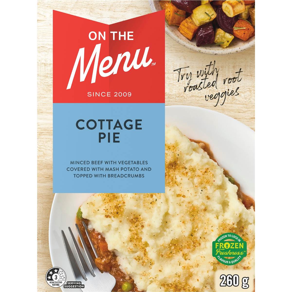 Meat Sauce (60%) Water, Vegetables (Tomato (Tomato, Acidity Regulator (330), Firming Agent (509)), Onion, Carrot, Peas, Celery), Beef (10%), Thickener (1422), Sugar, Vegetable Oil, Salt, Spices, Worcestershire Sauce, Yeast Extract, Herbs, Malt Extract (Barley), Potato Mash (38%) Water, Potato Flakes (Potato, Stabiliser (450), Preservative (222) (Sulphites)), Milk Solids, Vegetable Oil Spread (Soy), Salt, Spice, Topping (2%) Breadcrumb (Wheat), Cheddar Cheese (Milk), Parmesan Cheese (Milk), Spice, Herb.