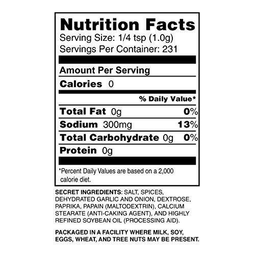 Secret Salt, Spices, Dehydrated Garlic And Onion, Dextrose, Paprika, Papain (Maltodextrin), Calcium Stearate (Anti-caking Agent), Highly Refined Soybean Oil (Processing Aid)