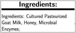 Cultured Pasteurized Goat Milk, California Orange Blossom Honey, Enzymes.