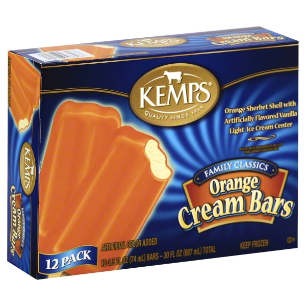 ORANGE CREAM ORANGE SHERBET SHELL WITH ARTIFICIALLY FLAVORED VANILLA LIGHT ICE CREAM CENTER BARS, ORANGE CREAM