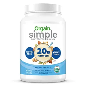 Orgain's Simple Plant Protein Powder in Creamy Vanilla flavor is a popular choice for those seeking a natural, nutritious protein supplement. Made with organic almonds, peanuts, chia seeds, pumpkin seeds, golden pea, and coconut sugar, this vegan protein powder contains no thickeners, gums, or stevia. With 20 grams of protein per serving, it provides a substantial boost to your daily protein intake. Certified USDA organic, vegan, dairy-free, gluten-free, soy-free, lactose-free, non-GMO, and kosher, this protein powder appeals to a wide range of dietary needs. Users appreciate the food-based ingredients and find the flavor delicious on its own. With only 8-10 ingredients, Orgain Simple Plant Protein Powder offers a clean and simple option for those seeking a quality protein supplement.