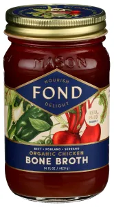 WATER, *FREE RANGE POULTRY (CHICKEN FEET, BACKS, NECKS), *BEETS, *CARROTS, *CELERY, REDMOND REAL SALT, *LEMON JUICE, *POBLANO, *SERRANO.