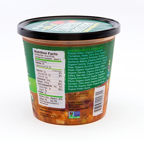 VEGETABLE BROTH* (FILTERED WATER, VEGETABLE BASE* (VEGETABLE STOCK* AND VEGETABLE CONCENTRATES* [CARROT*, CELERY*, ONION*, TOMATO*], SEA SALT, BLUE AGAVE SYRUP*, NUTRITIONAL YEAST*, POTATO STARCH*, TAMARIND PUREE*, CHAMPIGNON MUSHROOM POWDER*, GARLIC POWDER*, GUAR GUM*, SPICE*)), TOMATOES* (TOMATOES*, WATER, CITRIC ACID, CALCIUM CHLORIDE), CARROTS*, ZUCCHINI*, PEAS*, KIDNEY BEANS*, ONIONS*, POTATOES*, PASTA* (RICE FLOUR*, QUINOA FLOUR*), TOMATO PASTE*, GARLIC*, EXTRA VIRGIN OLIVE OIL*, BASIL*, AGAVE NECTAR*, SEA SALT, SPICES*, CAYENNE PEPPER*.